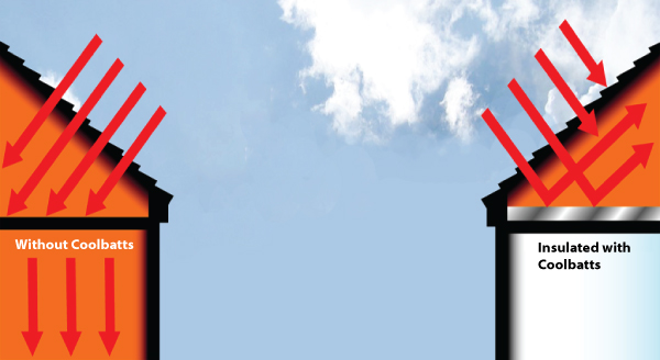 Without Coolbatts, heat passes from outside through the roof, ceiling and walls of your house, making it as hot or even hotter inside your house than outside. With Coolbatts insulation installed in the ceiling of your house, you will stop up to 70% of heat form flowing in and keep your house significantly cooler. If you are building a new home and therefore have the opportunity to insulate the walls, then this heat flow can also be reduced by up to 70%. Coolbatts will keep your indoor temperature much cooler and with an air-conditioner, Coolbatts will make it much more efficient and cost effective to run.